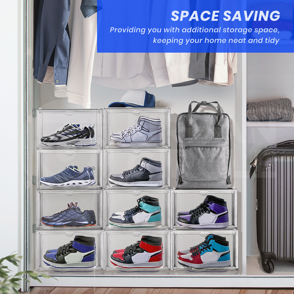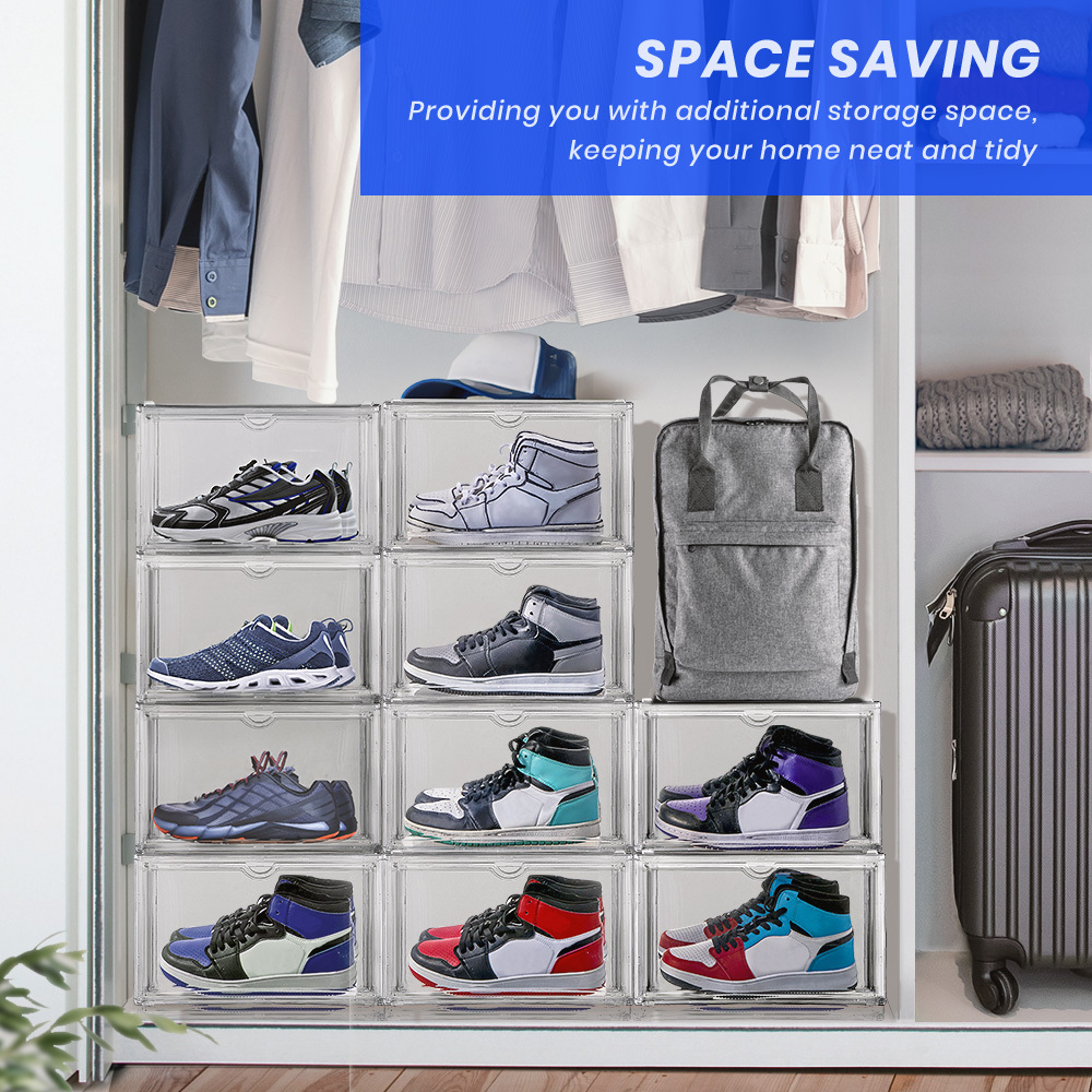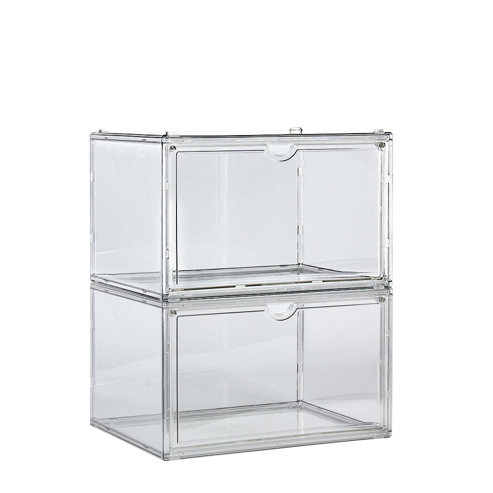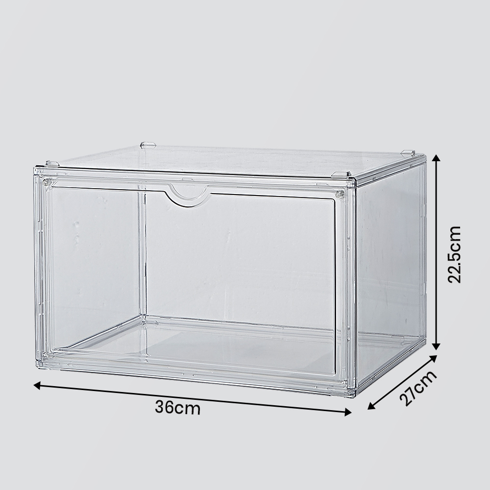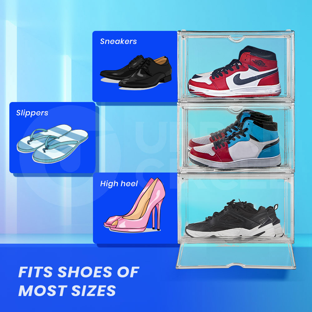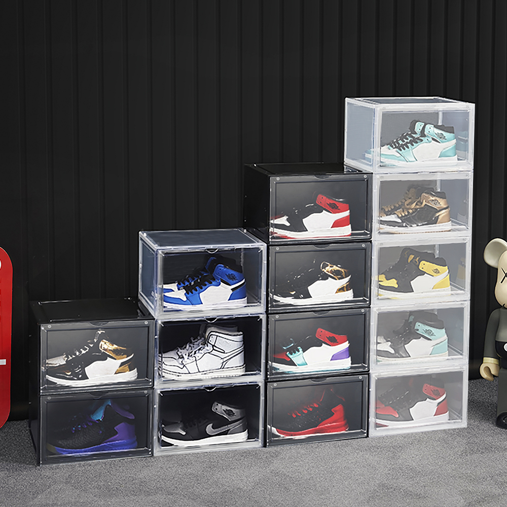 Our new shoe boxes with clear front door can help you solve the above problems. Not only does it clearly display all your shoes in all directions, it also stacks neatly and stably to blend in with your modern furniture and decor.