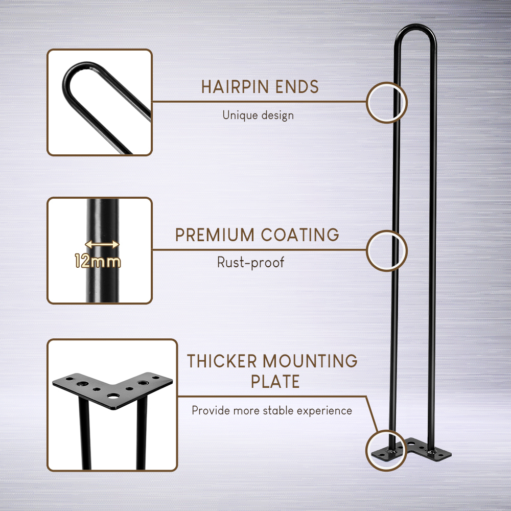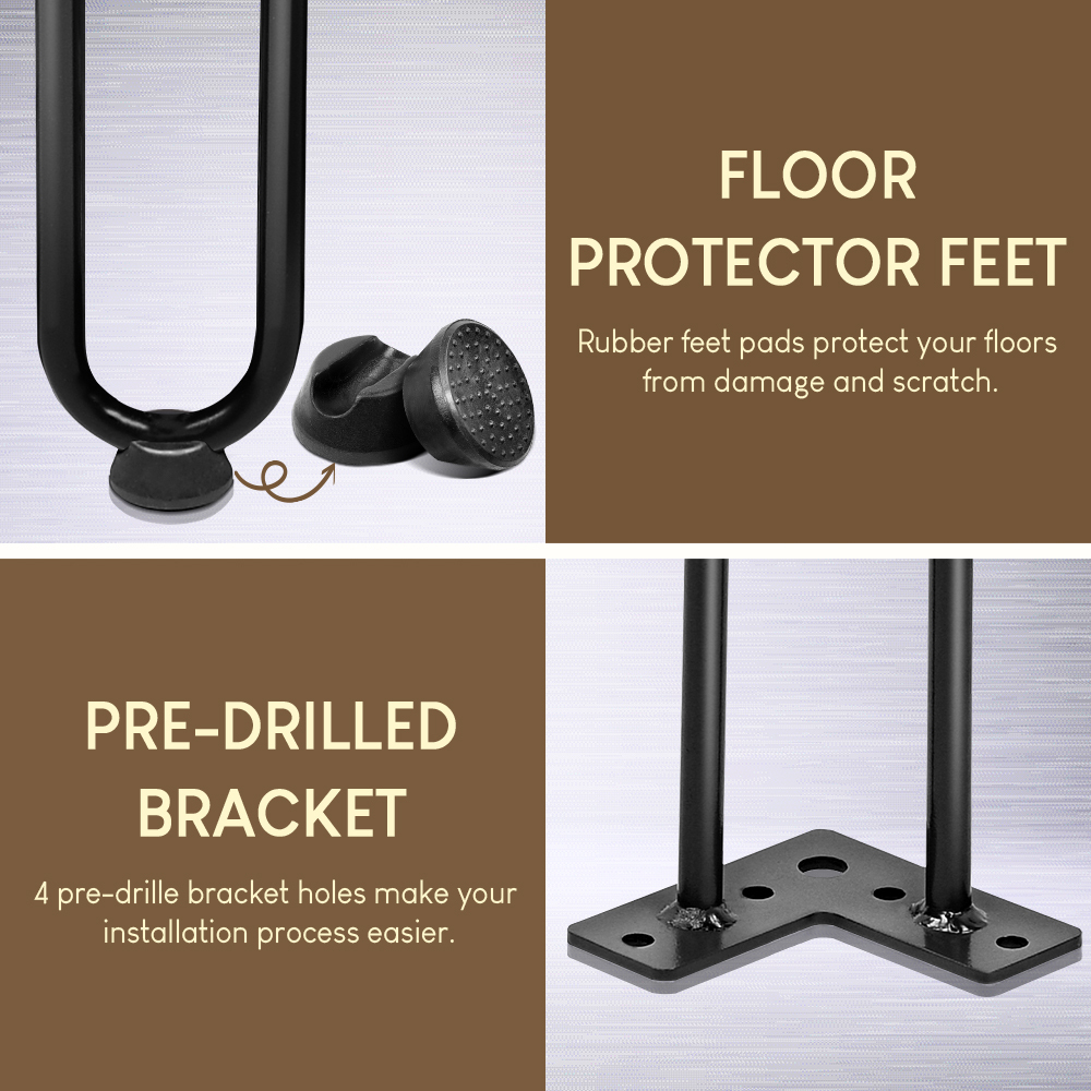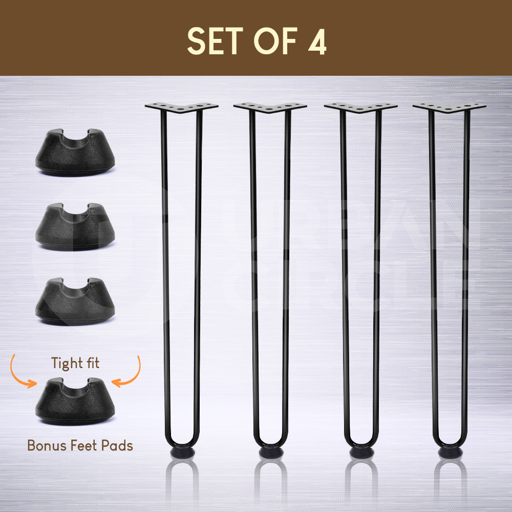 Furb's table legs in modern and industrial design allow you to customise your table, as well as restyling your interior d¨¦cor for your urban home. Furb's table legs are made of premium iron tube with 12mm diameter rod, reliable and designed for long-term use. Our table legs have a strong frame of 150kg weight capacity, They also come with leg protectors which can be attached to each leg for increased stability and prevent scratching your floor. The pre-drilled holes are designed to assist installation to your favourite table top. The surface is coated in matte black and are rust-resistant. The table legs are widely used for coffee tables, bedside tables, dining tables, bench and any kind of furniture that you'd like to restyle and DIY.