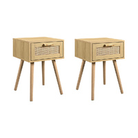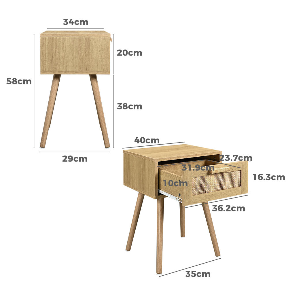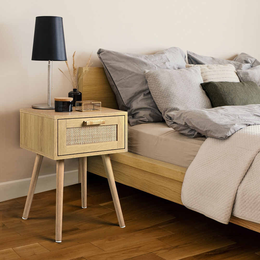 This compact bedside table blends Scandinavian style with natural rattan texture for a fresh, modern look. Made from 15mm MDF with a matte wood-look finish, it features one spacious drawer with a gold metal knob and solid pine legs for stability. The handwoven rattan drawer front adds texture, while EVA pads protect your floor. Ideal as a small nightstand or side table, it's perfect for bedrooms, apartments, or reading corners. Easy to assemble with smooth-glide runners.