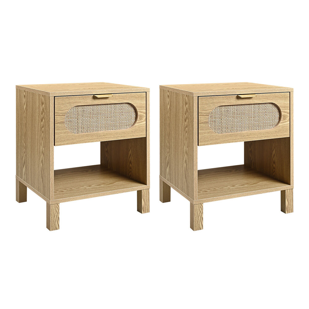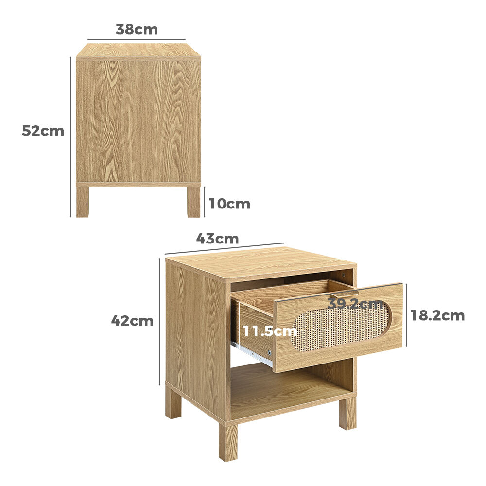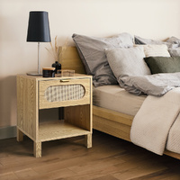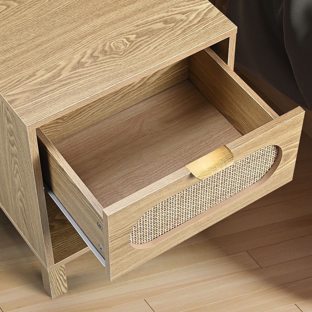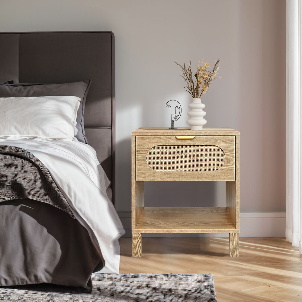 This bedside table combines modern simplicity with natural textures, featuring a genuine rattan drawer and an open shelf for convenient bedroom storage. Perfect as a small nightstand or side table, it fits beautifully into tight spaces while providing both open and closed storage. Made from 15mm MDF with a matte wood-look finish, it includes a black metal handle and EVA foot pads. A stylish and practical choice for any bedroom or guest room.