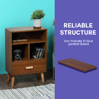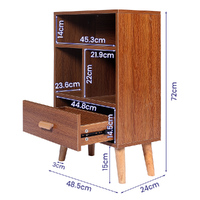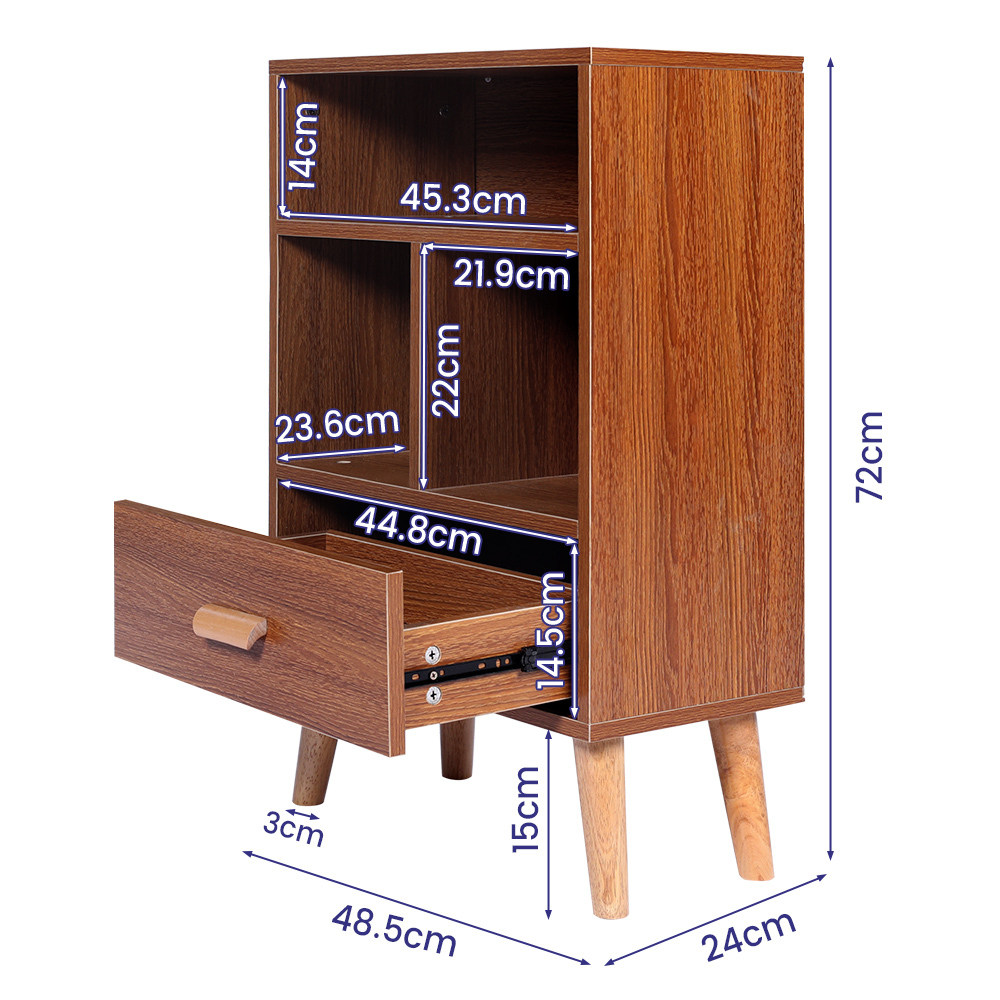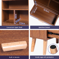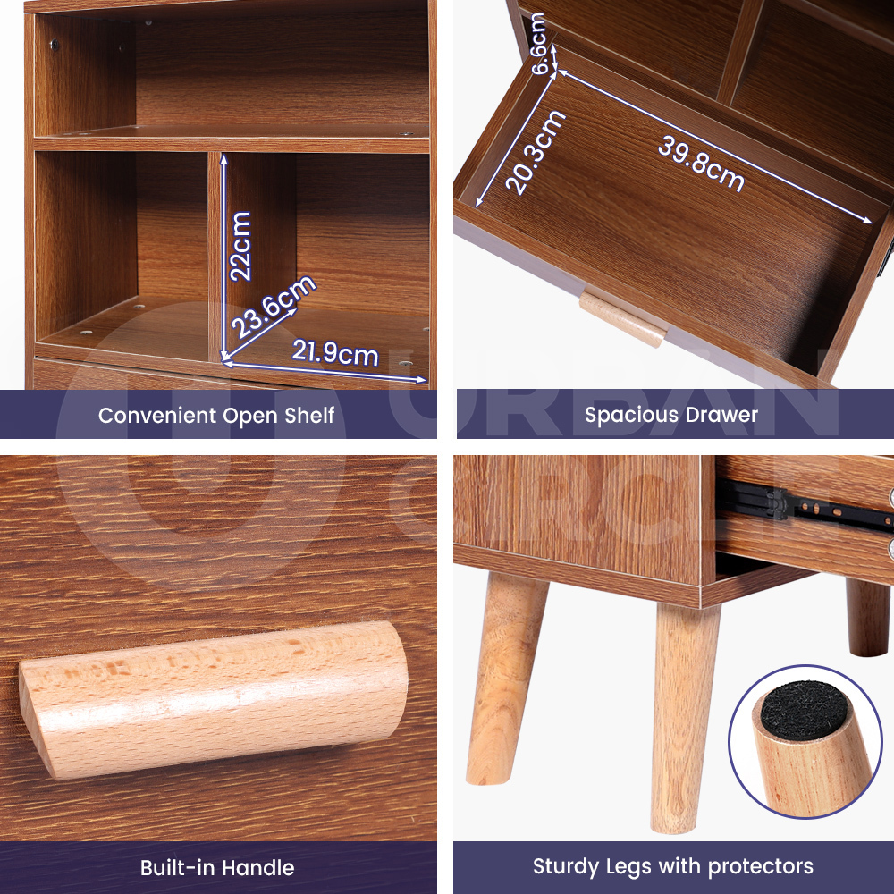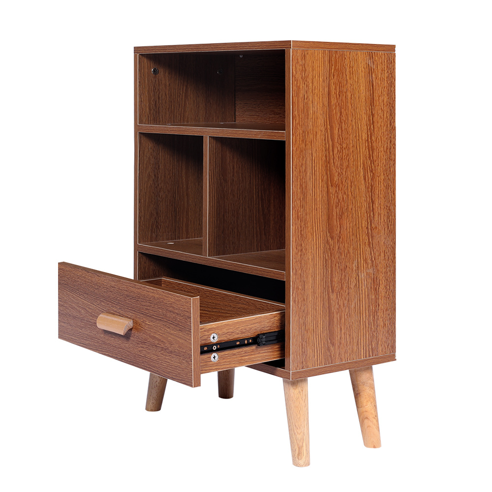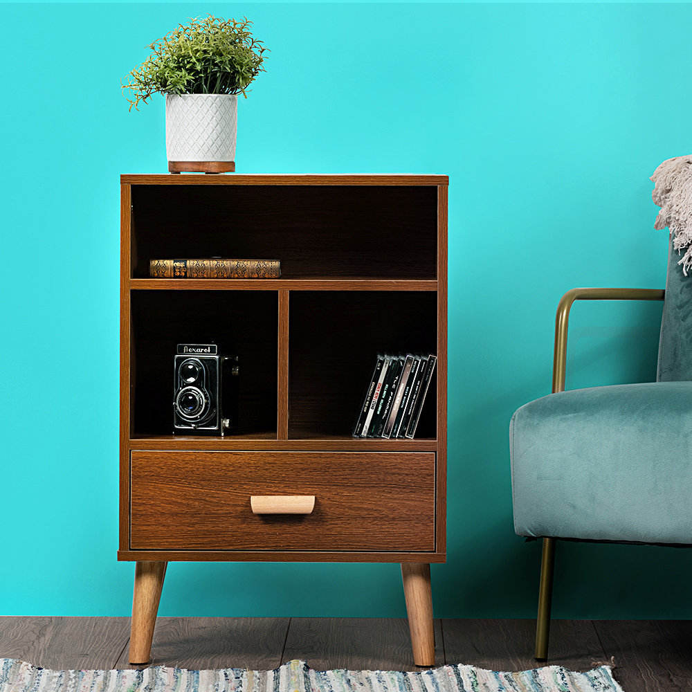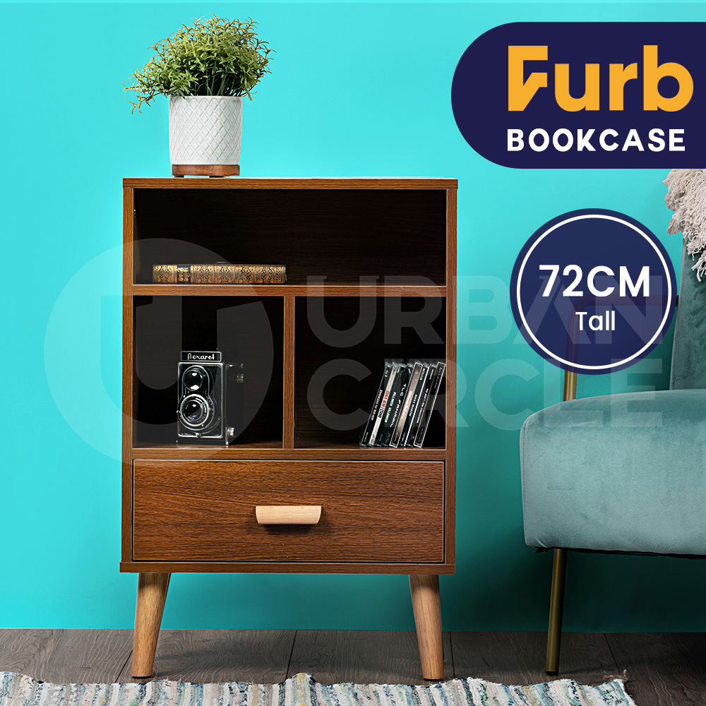 The Furb bookcase provides a small and simple storage with open design of shelves which is a fantastic space-saving option to put in corners of your room or office. The Furb bookcase has the best of everything you want as small storage solution. With three spacious shelves and a drawer, this display shelf lets you showcase all your favourite items openly and your personal pieces in the drawer. This bookcase is made of E1 glue grade 15mm thick particle board with a smooth veneer which is eco-friendly and reliable for long time use. Melamine paper with wooden pattern finish supported by solid wooden legs, these unique appearance allows you to enjoy both retro and modern styles. Reshape your storage space with the Furb's charming vintage and modern bookcase, making your reading area elegant and stylish at all times.