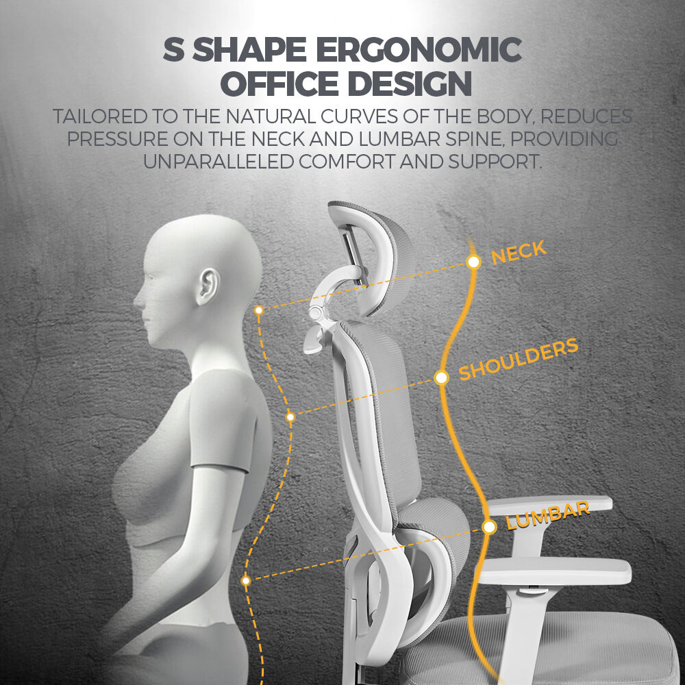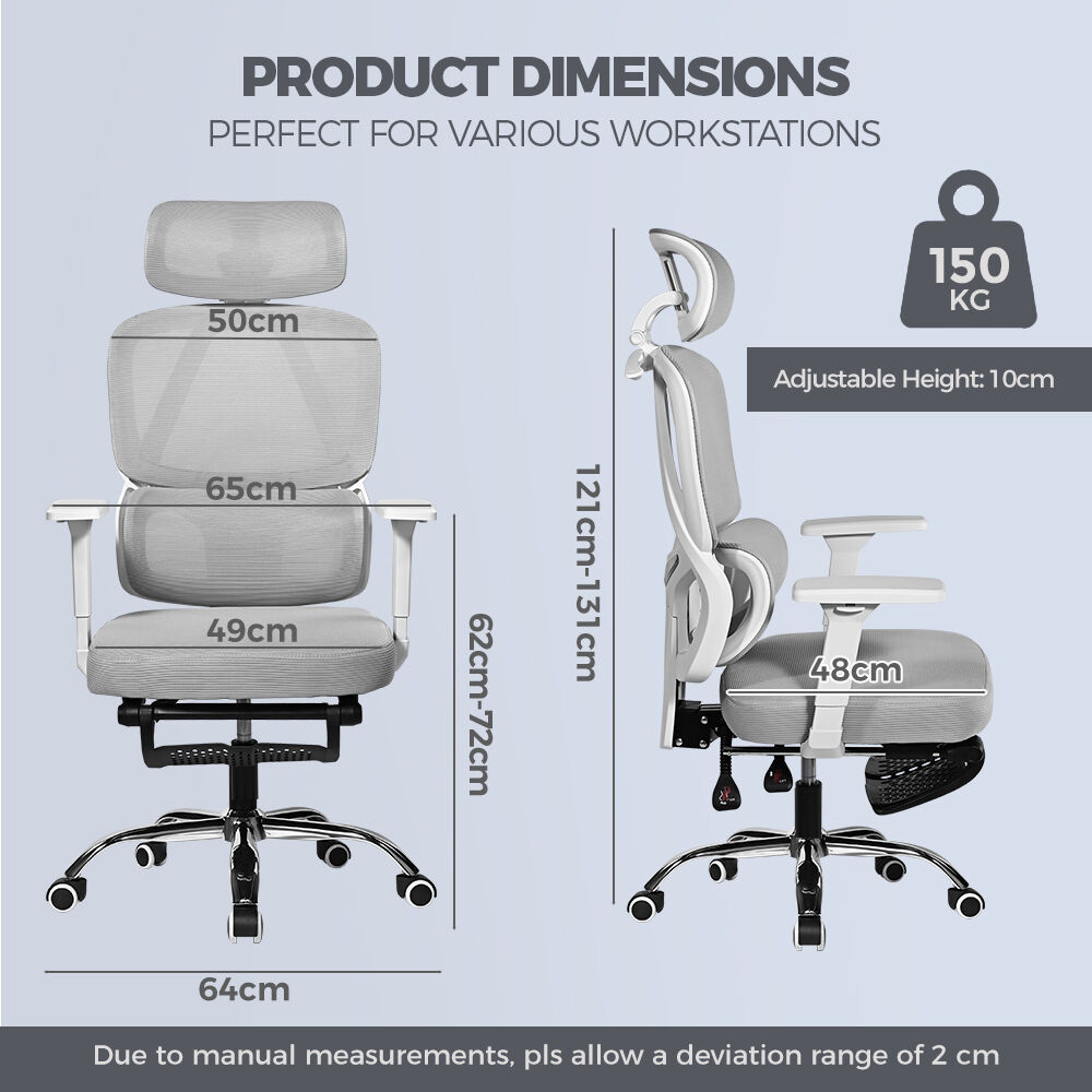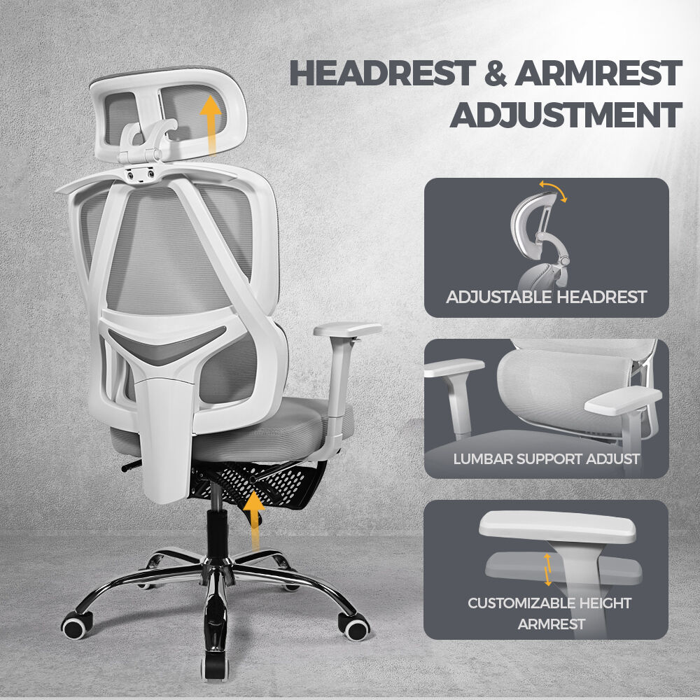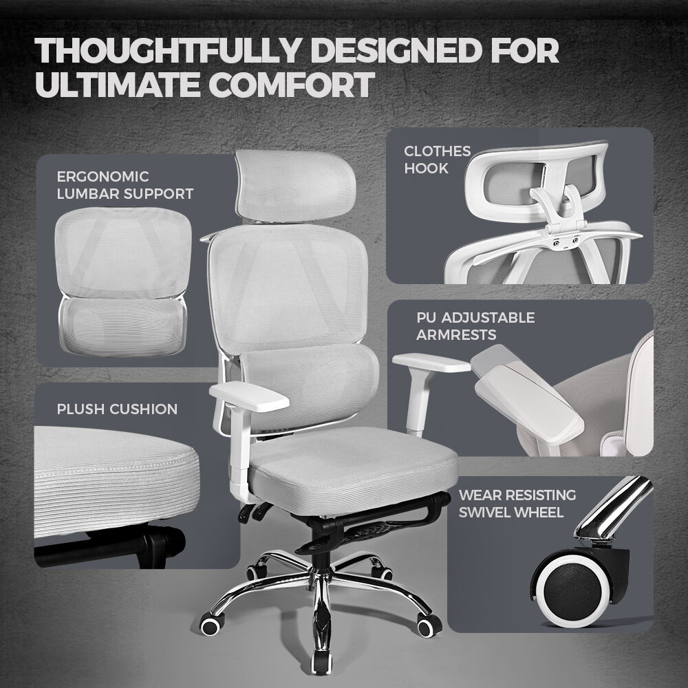 Crafted with mesh material for maximum breathability, this chair keeps you cool and refreshed throughout the day. With its adjustable headrest and 3D multi-function PP armrests, you can customize the chair to fit your unique needs and preferences.The 10cm height adjustment ensures that you can find the perfect seating position, while the tilt tension allows for smooth reclining from 90 to 135 degrees. Retractable footrest is your best companion during your afternoon break.
