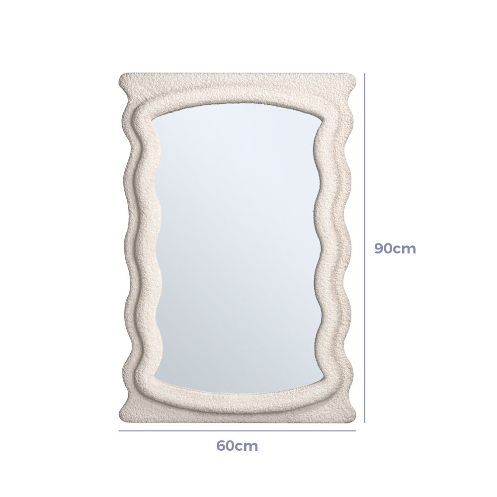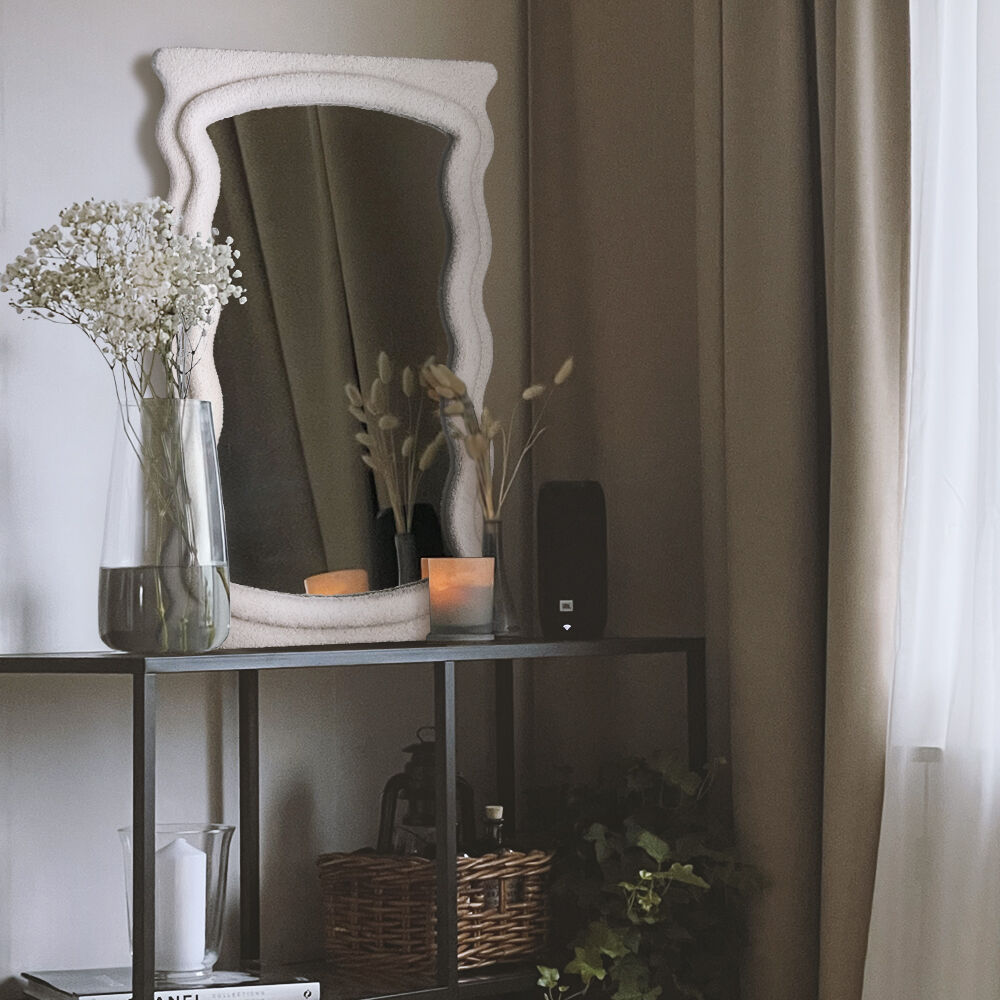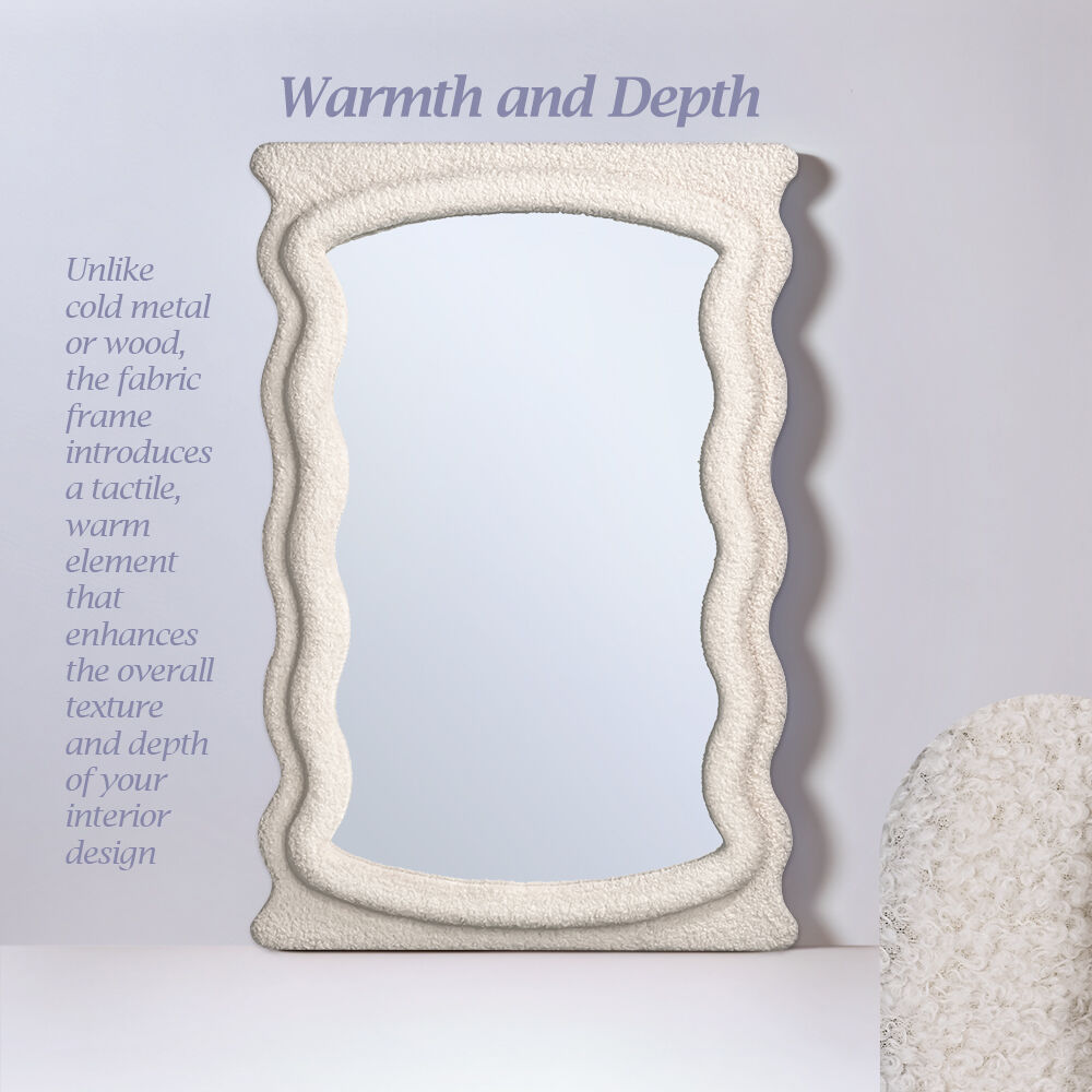 Add a touch of whimsy and elegance to your space with this irregular, fluffy wall mirror. Designed to stand out, its soft, textured edges and unique shape make it an eye-catching centerpiece. Whether hung on the wall or leaning against it, this makeup vanity mirror adds a playful yet sophisticated vibe to any room. Ideal for living rooms, bedrooms, or entryways, its soft, plush frame brings warmth and charm to your home décor.