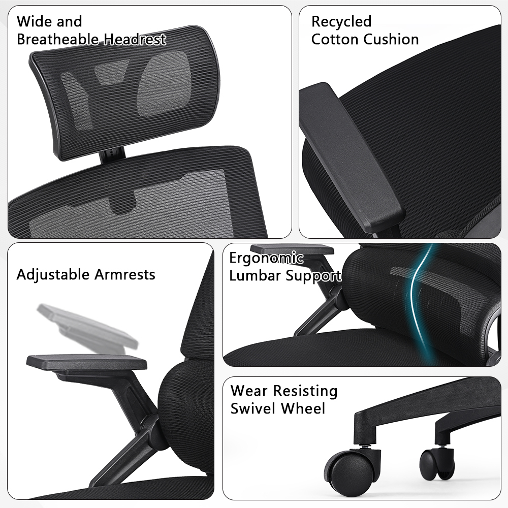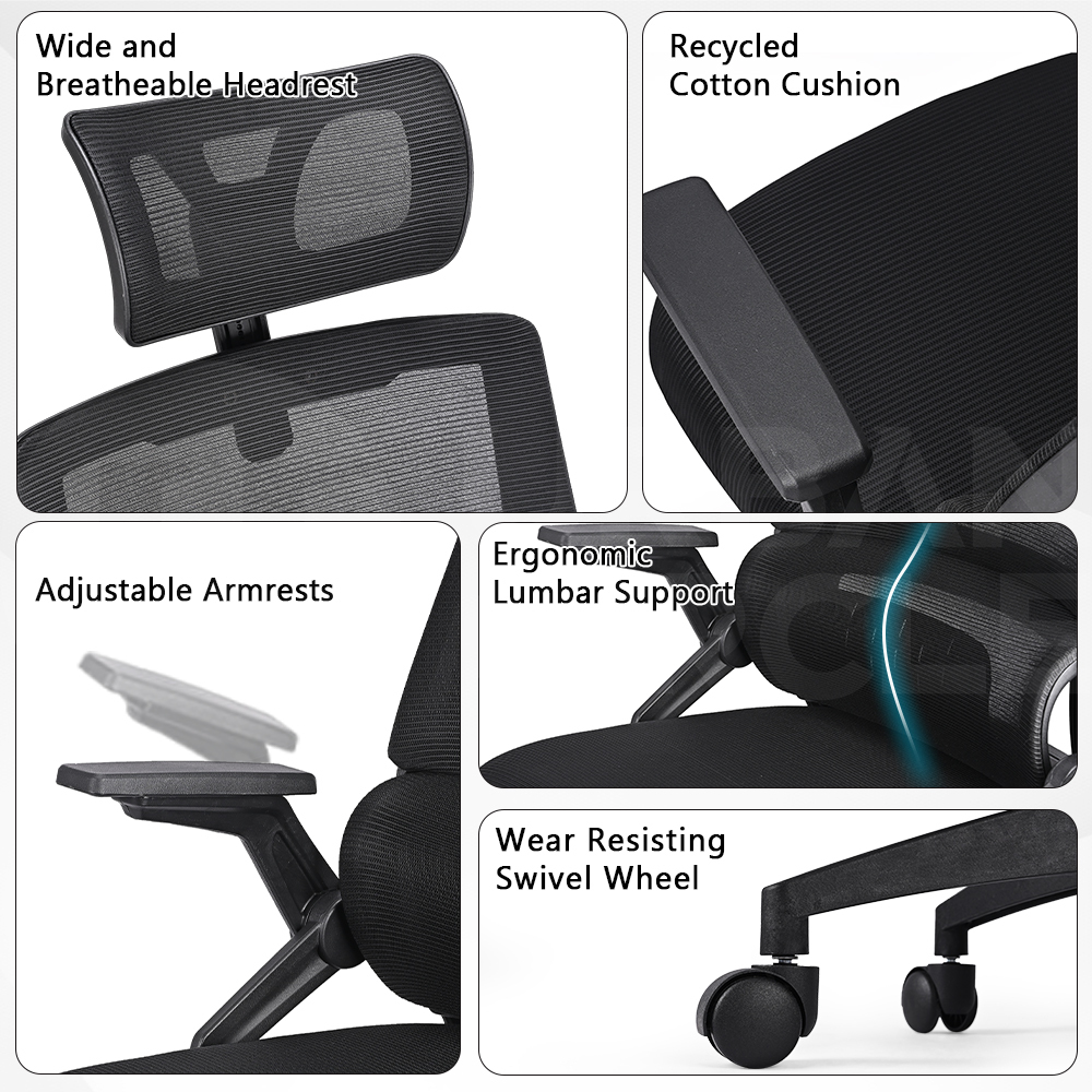 * Ergonomic high-back design. Divisional back and self-adaptive lumbar support