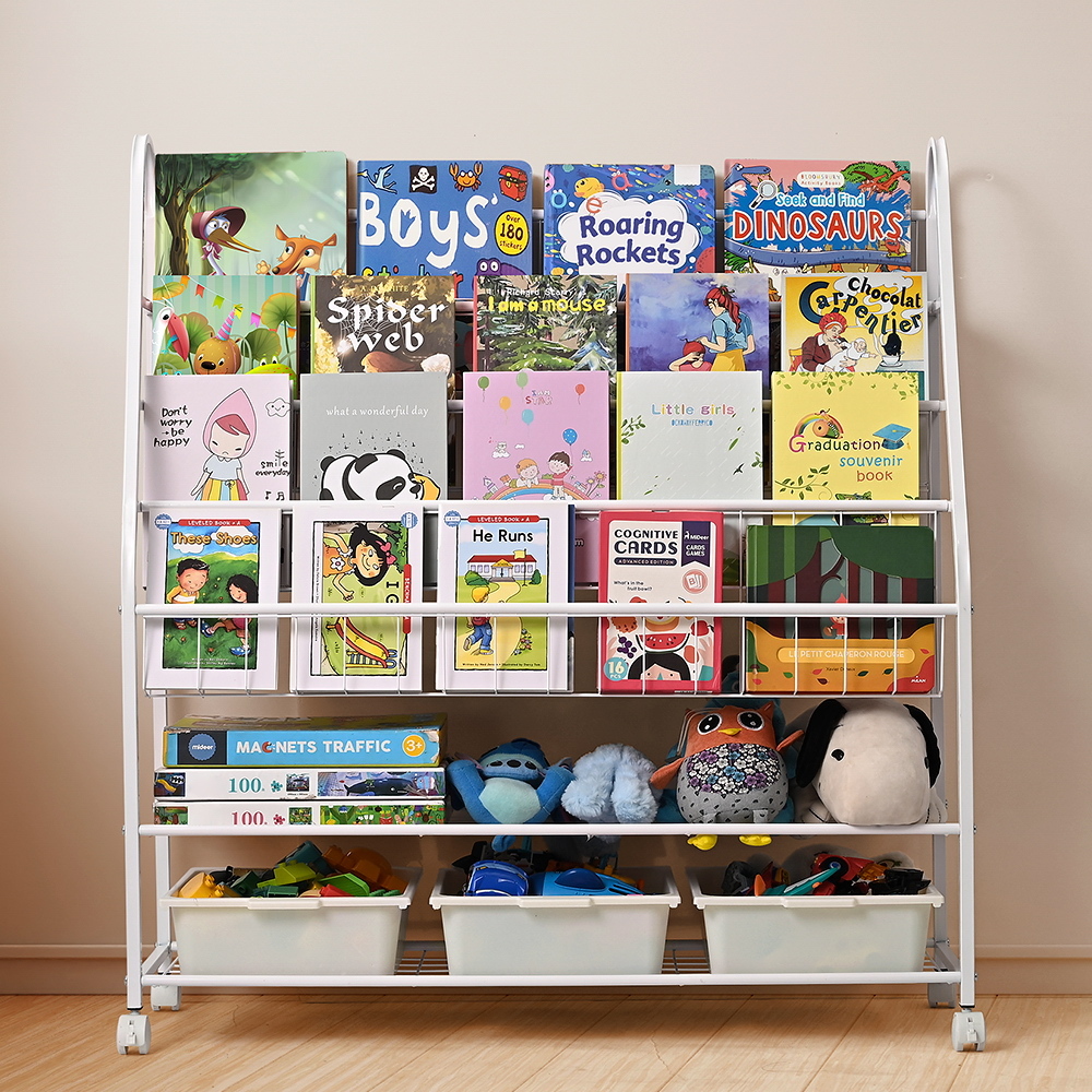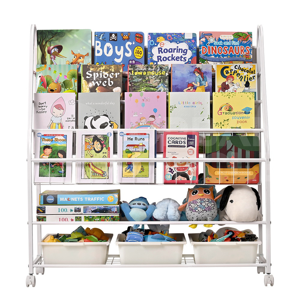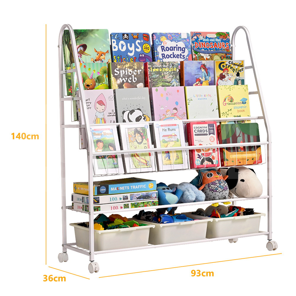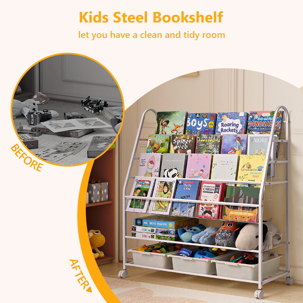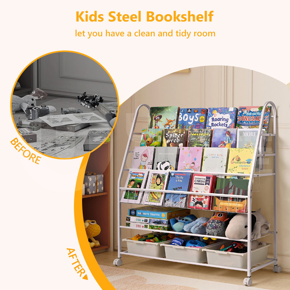 This children bookshelf offers ample storage space and looks great in any playroom, bedroom, or study. The 4-tier display shelf can easily hold over 20 books, and the 2 bottom storage units provide spacious room for toys. Additionally, it comes with 3 plastic storage bins for organizing small toys. The bookshelf is made from high-quality steel, and its rounded corners are specially designed to ensure safety for children.
