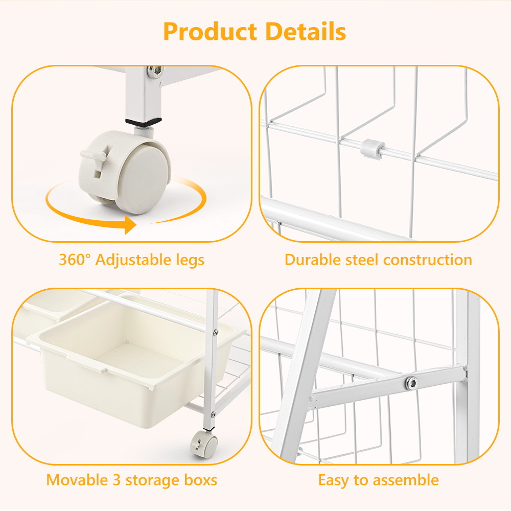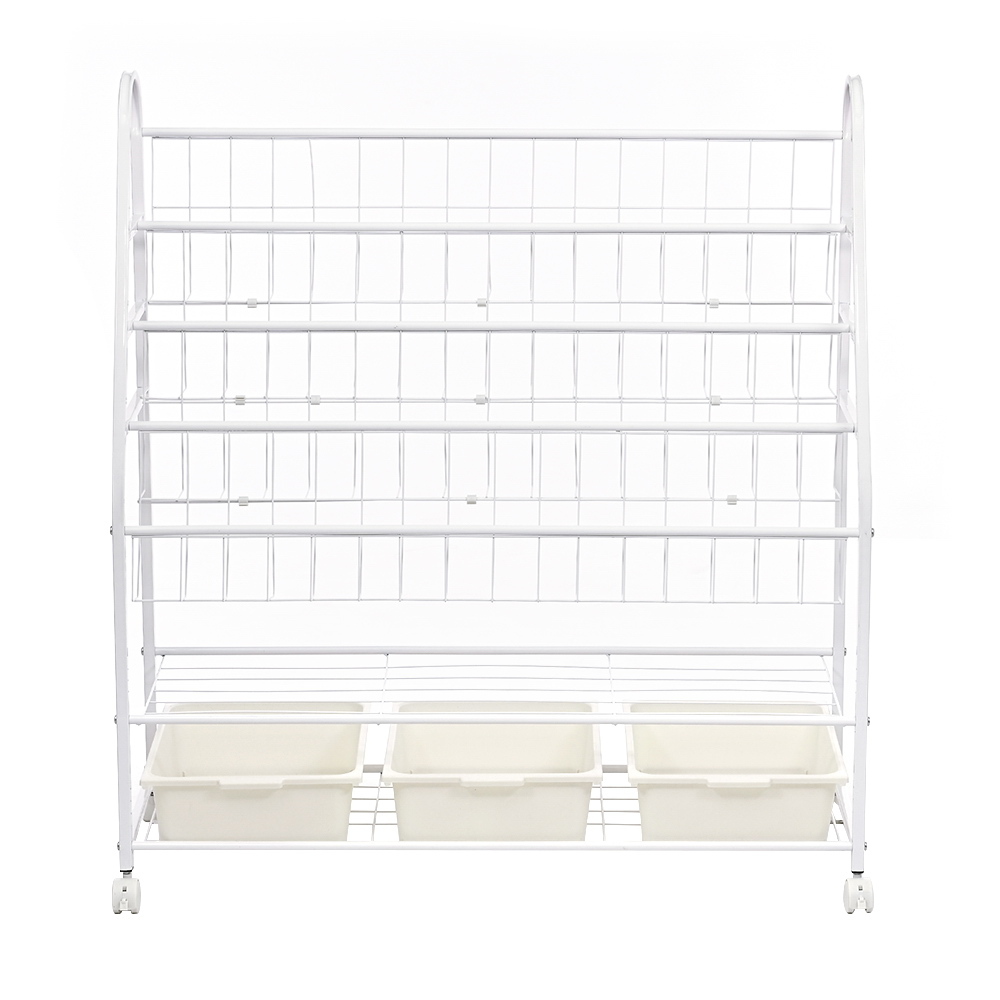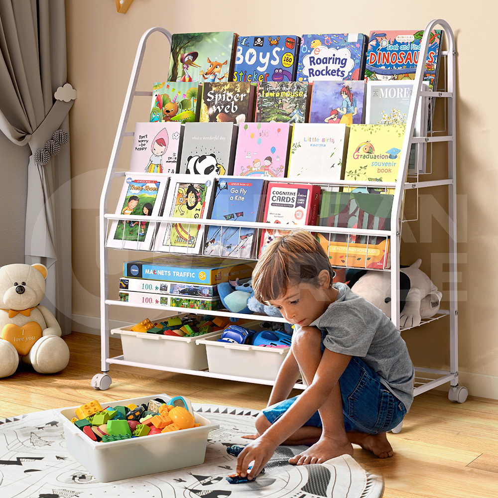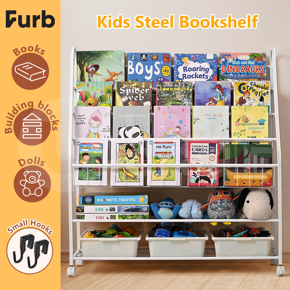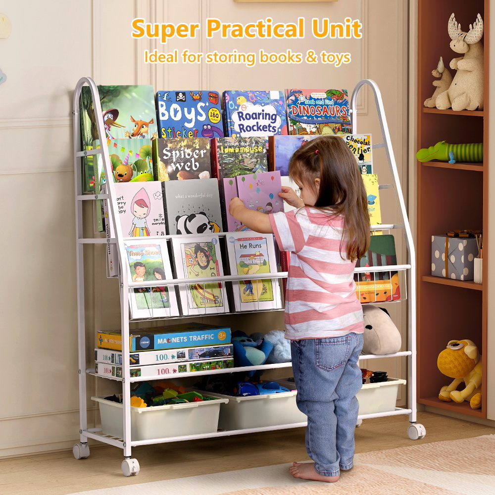 This children bookshelf offers ample storage space and looks great in any playroom, bedroom, or study. The 4-tier display shelf can easily hold over 20 books, and the 2 bottom storage units provide spacious room for toys. Additionally, it comes with 3 plastic storage bins for organizing small toys. The bookshelf is made from high-quality steel, and its rounded corners are specially designed to ensure safety for children.