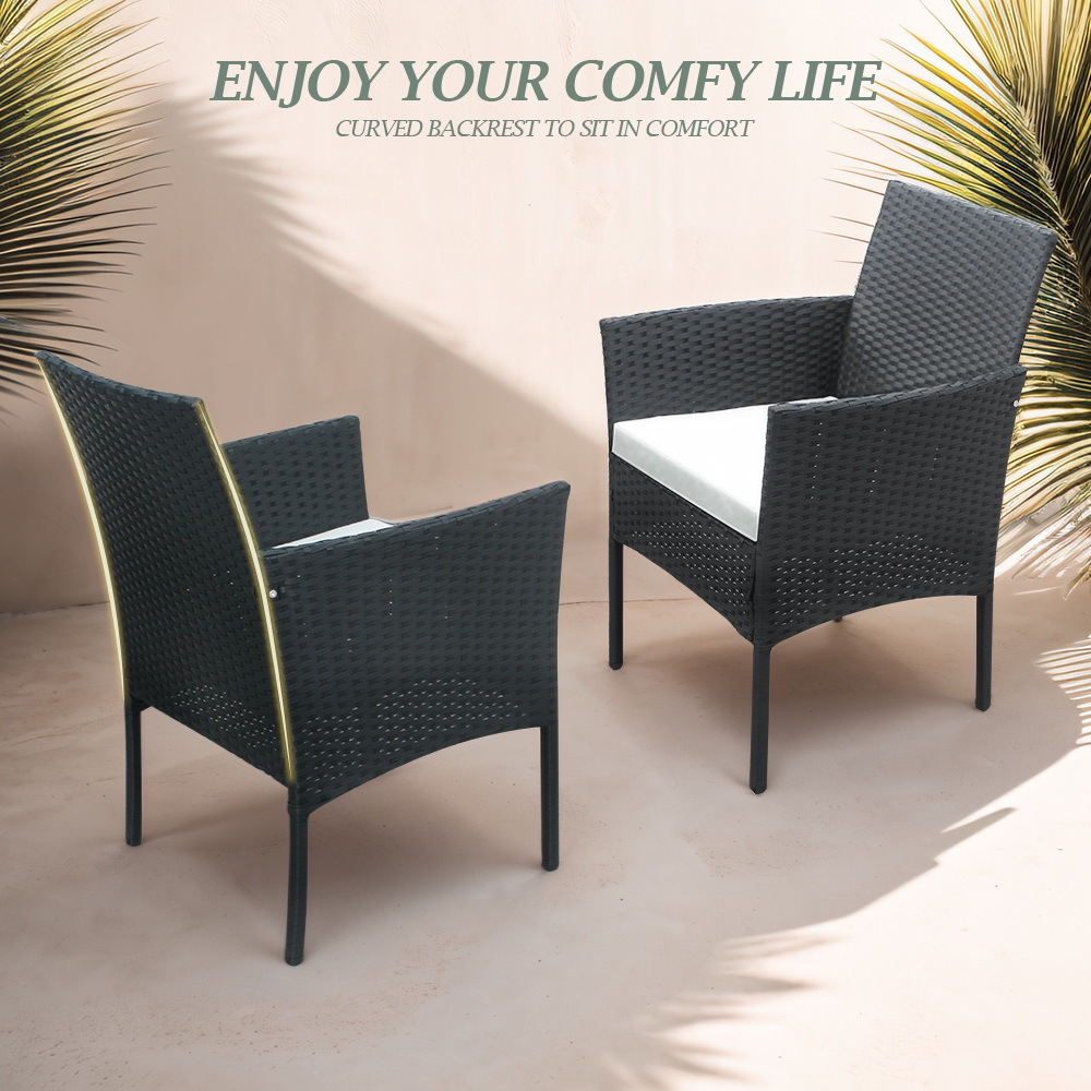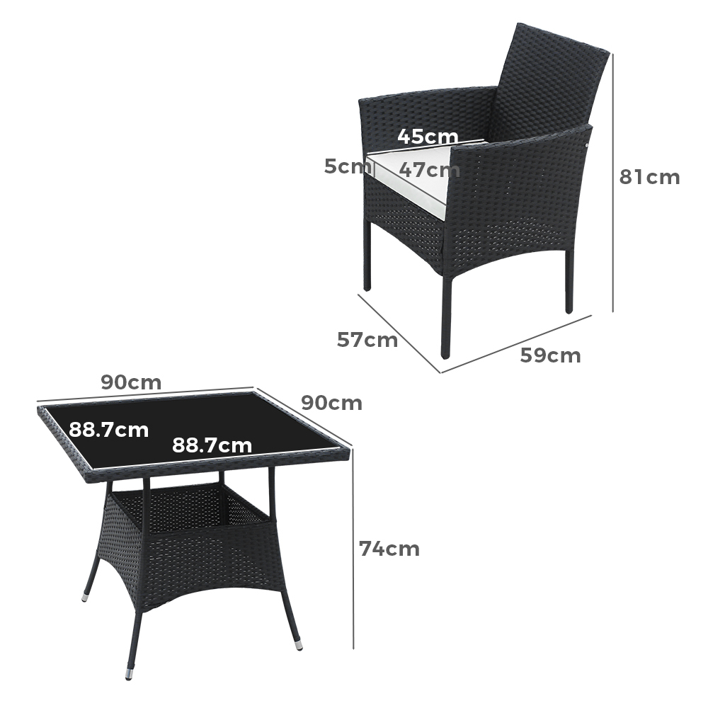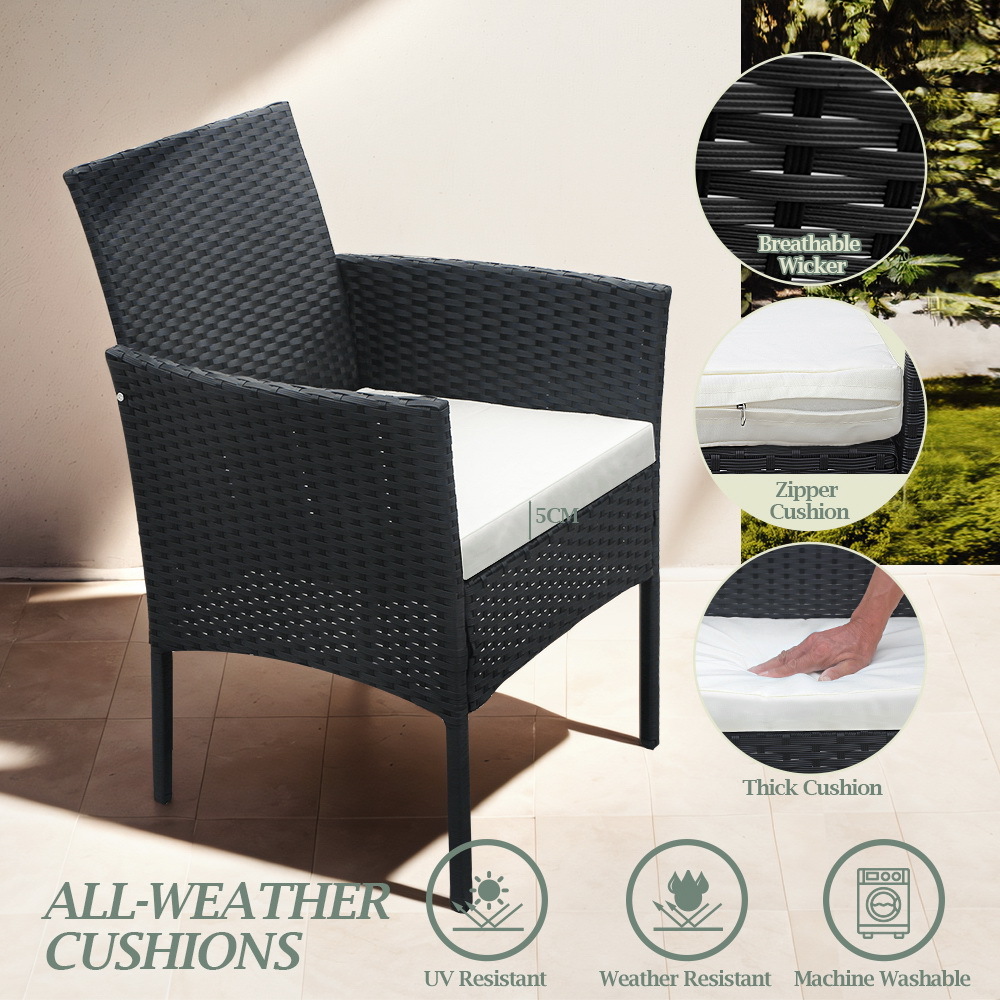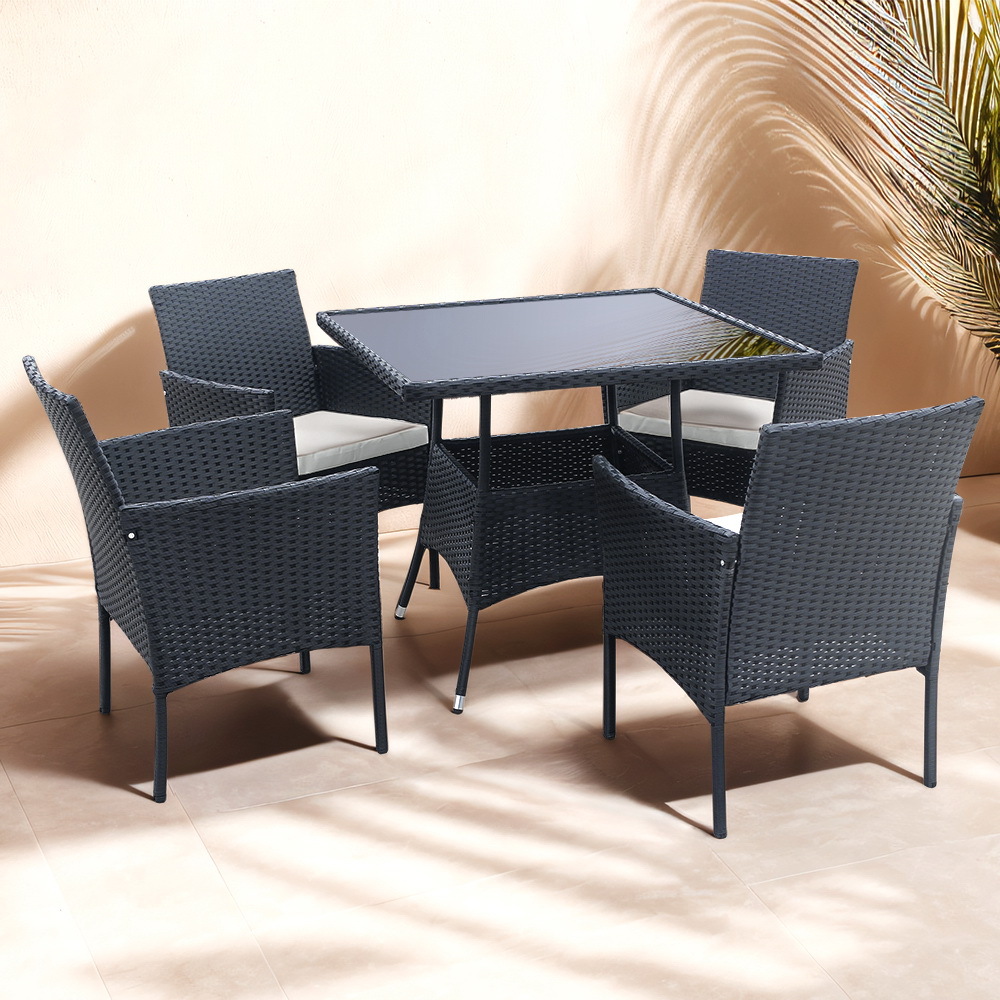 This patio 5-piece wicker dining set includes one table and four chairs, each with a cushion. It's made of high-quality steel frame, and covered with all weather PE rattan wicker, ensuring both durable and lightweight, without the bulkiness of traditional patio furniture. Its stylish and modern appearance, make it can blend well into different outdoor space. It's the excellent lounging choice for patio, porch, poolside, or garden area use.