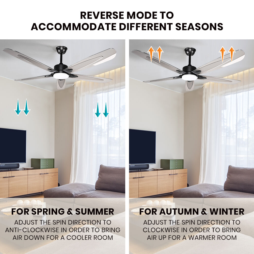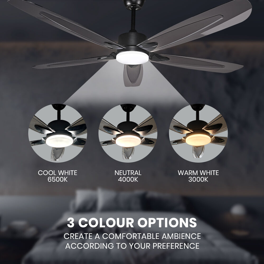 Keep your rooms cool during summer and balmy during winter. Equipped with a powerful DC motor, the Krear Ceiling Fan comes with a reverse cycle mode that allows blades to keep the air down for cooling during warm seasons and up for warming during winter. Enjoy a cozy ambience with energy-efficient LED lighting of the ceiling fan with three colour choices to suit your mood.
