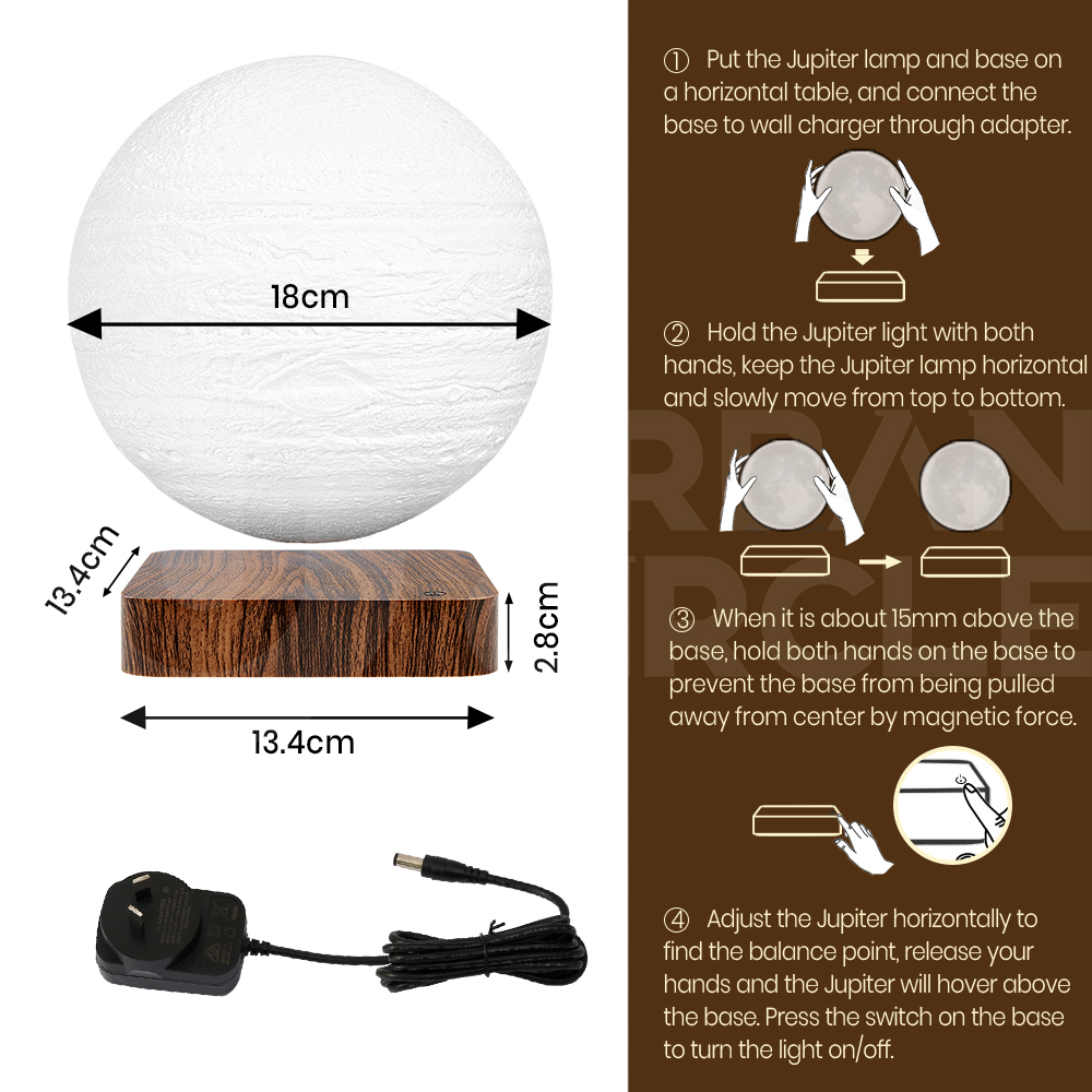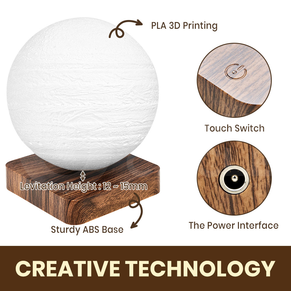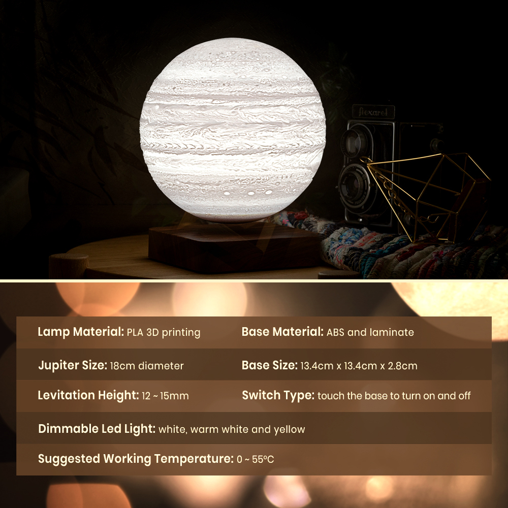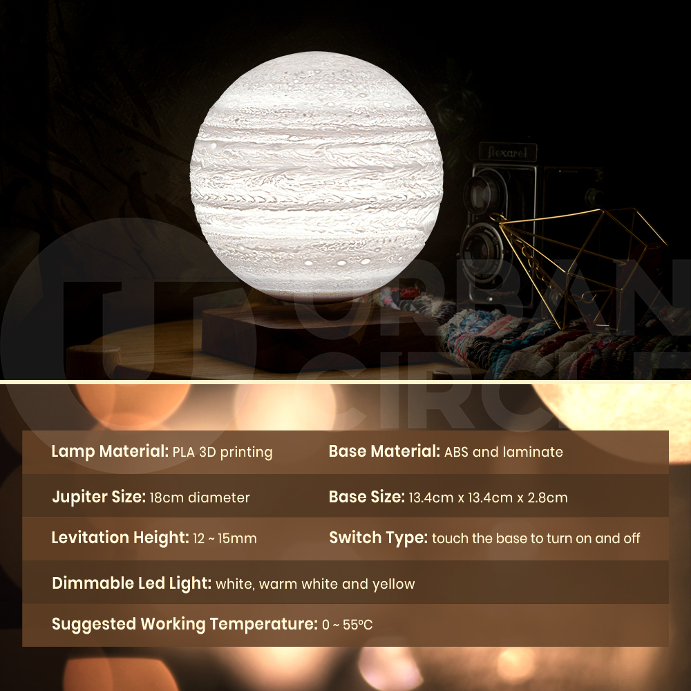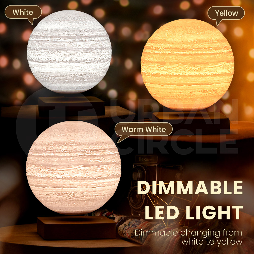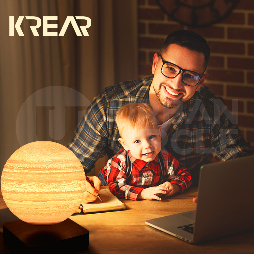 Relax your senses and float away into a state of tranquillity with Krear's captivating Levitating Lamp. Using magnetic nature, watch the 3D lamp spin and hover above its limber base. Featuring 3 lighting modes that include white, warm white and yellow tone. The sophisticated design of its wooden base adds a sense of calmness to the environment which also helps to set up a relaxing Jupiter in the space. Watch as the Jupiter spins and floats effortlessly, creating a sense of calm and removing anxieties and busy thoughts. Relax in your space and challenge your skills to find the perfect balance on Krear's Levitating Lamp.