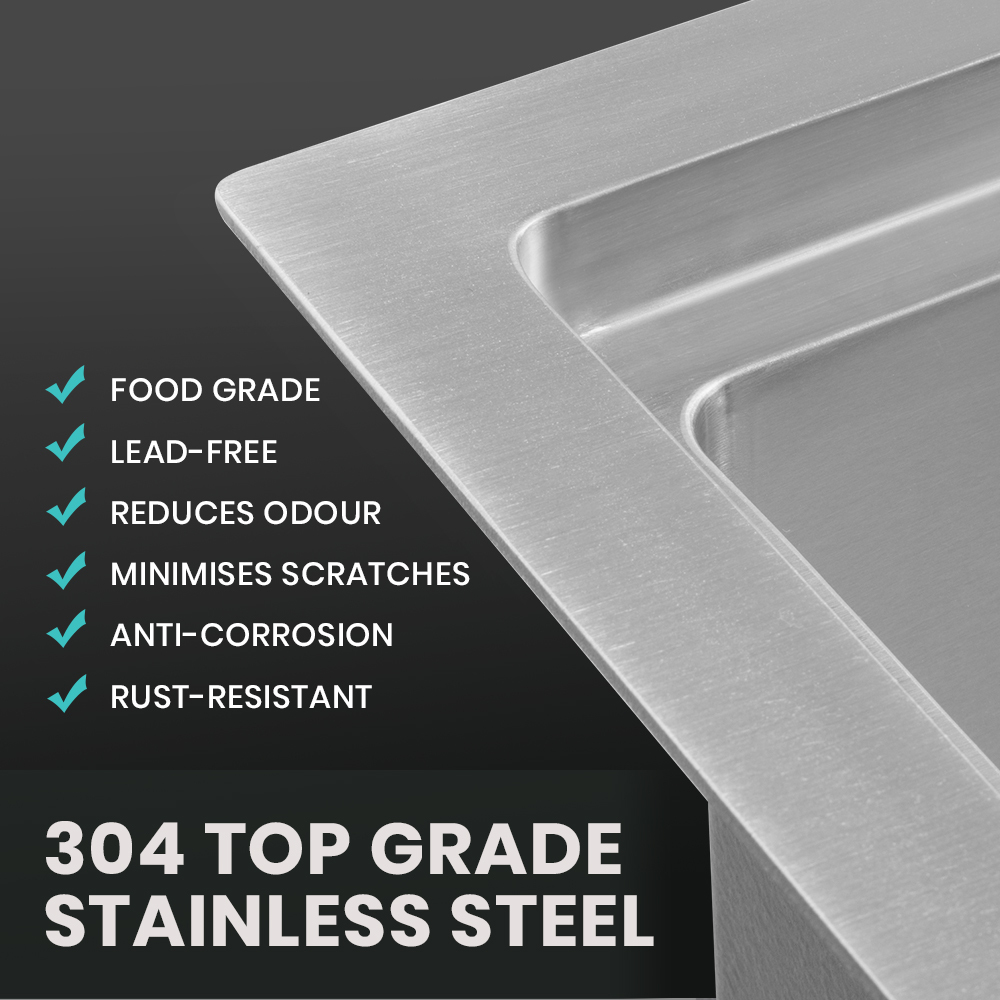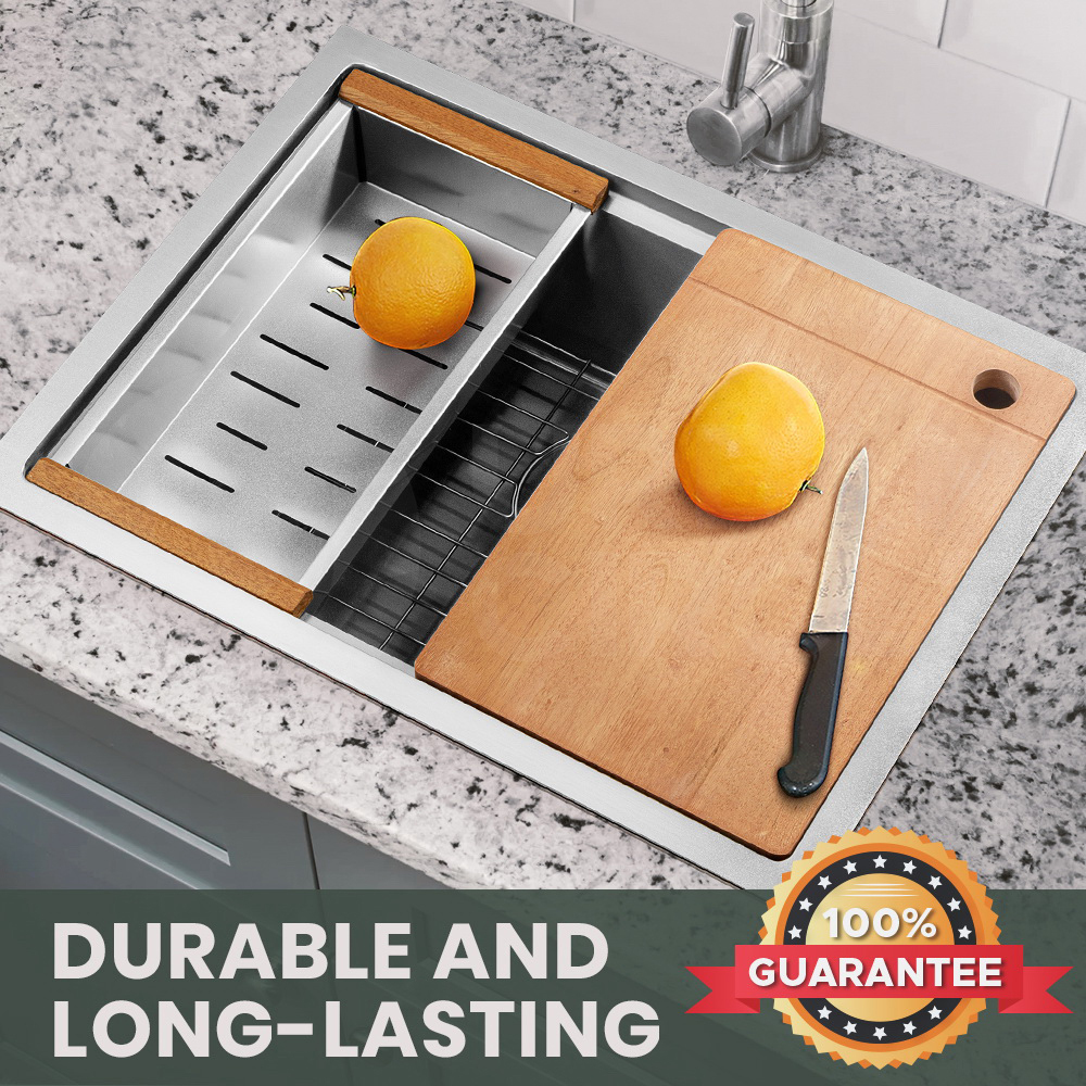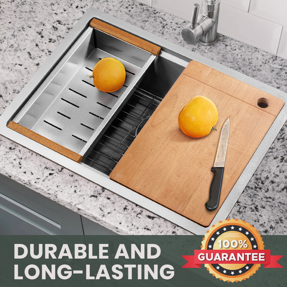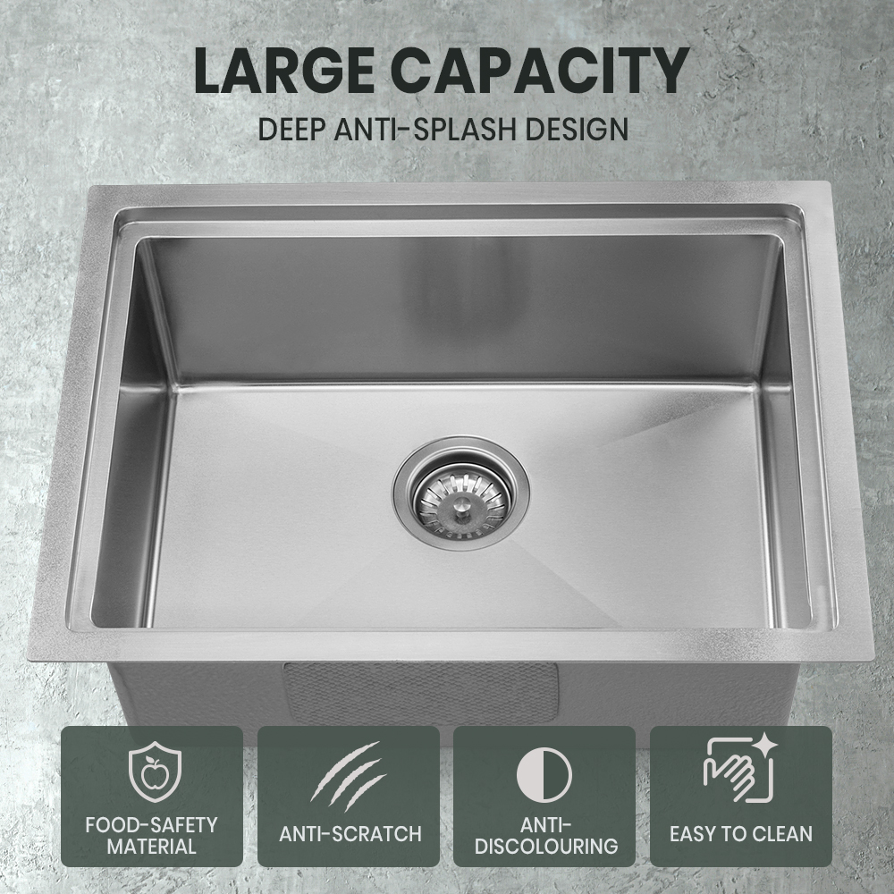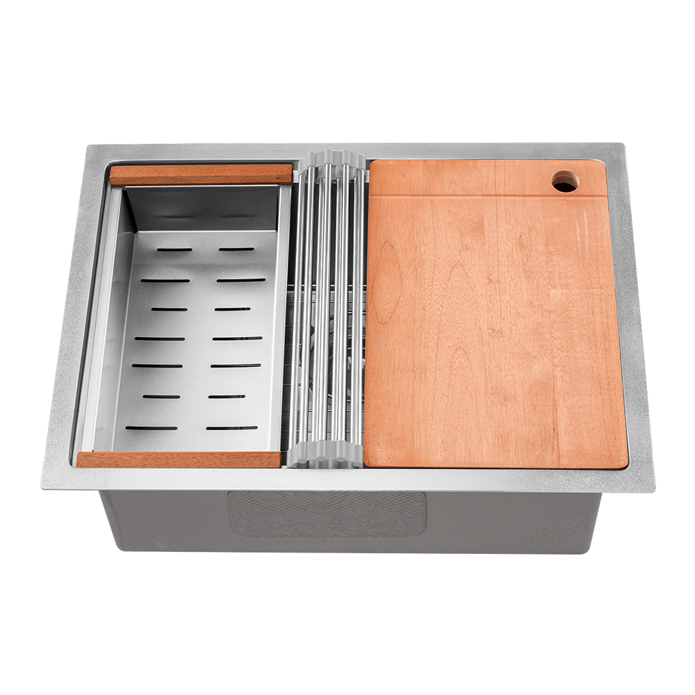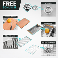 In the package, you'll find not just a sink but a complete kitchen solution ¨C including a waste strainer, a chopping board, a roll-up rack, colander, and a dish grid. Elevate your culinary space with a sink that goes beyond the ordinary, offering functionality, durability, and unmatched style.