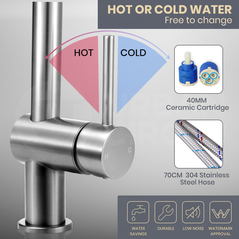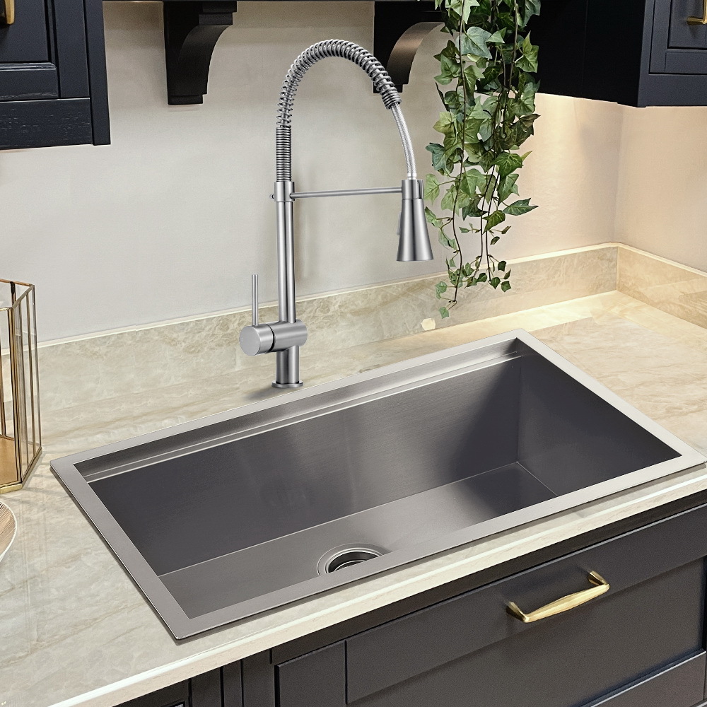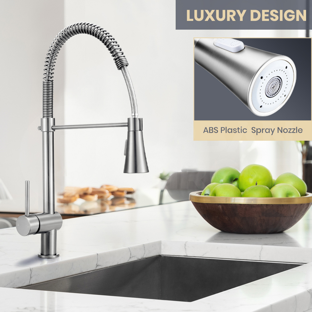 Give your kitchen a sleek makeover with the faucet. Great alternative to commom faucets, the ( pull-out ) faucets make kitchen cleaning easier and more effective in your sink. DR brass or stainless steel body, ceramic spool, and the gooseneck allows you to swivel the water in any direction.
