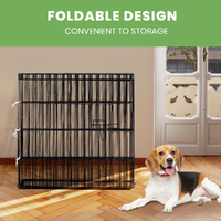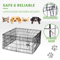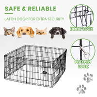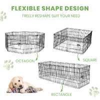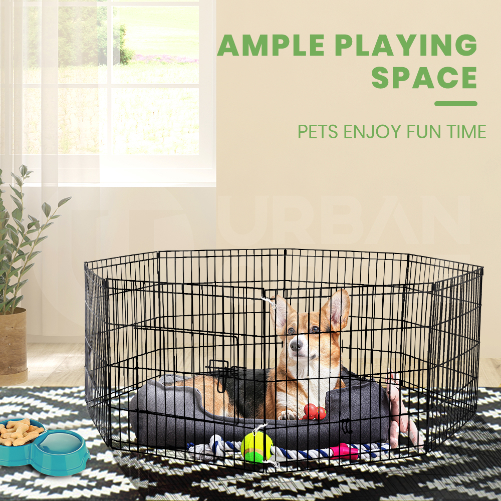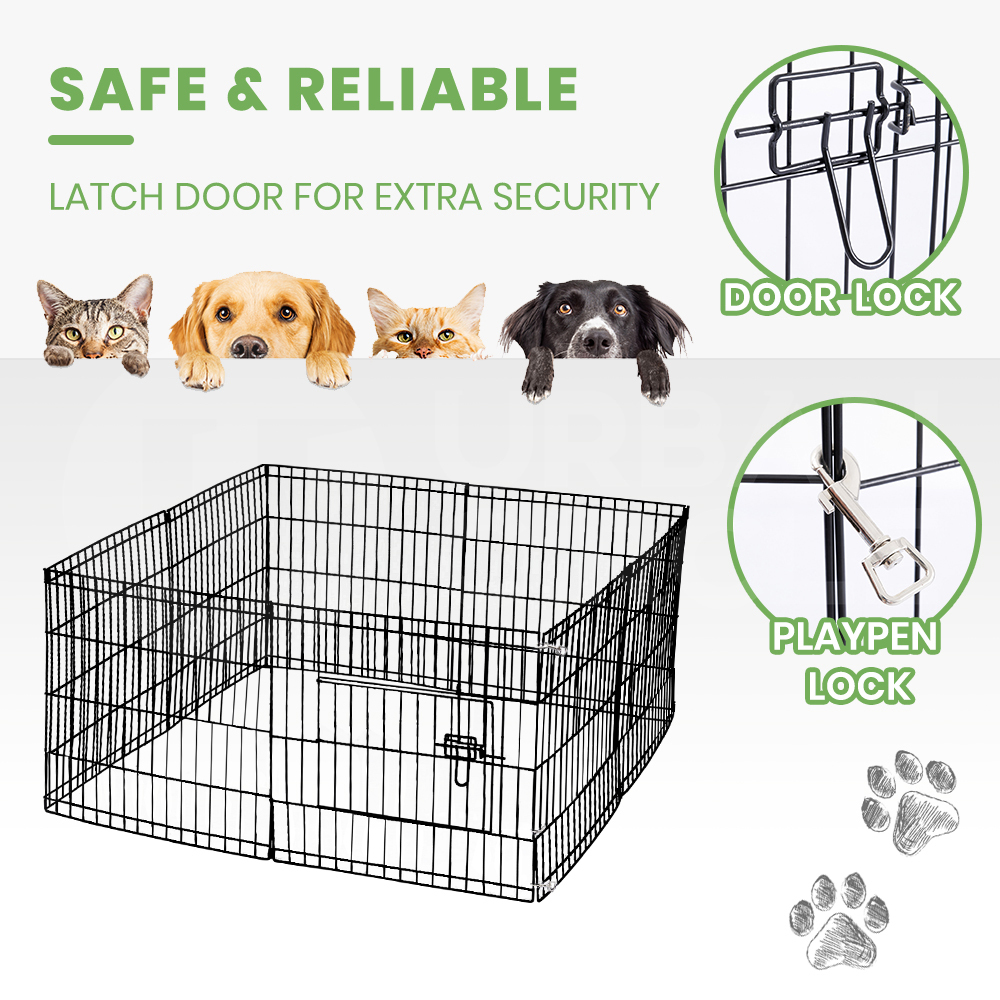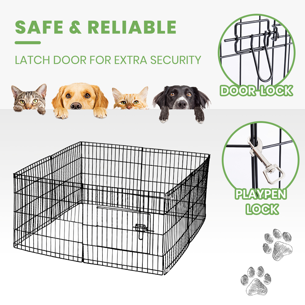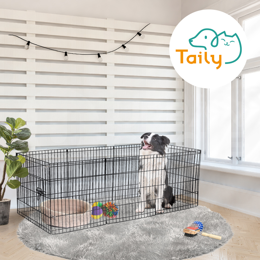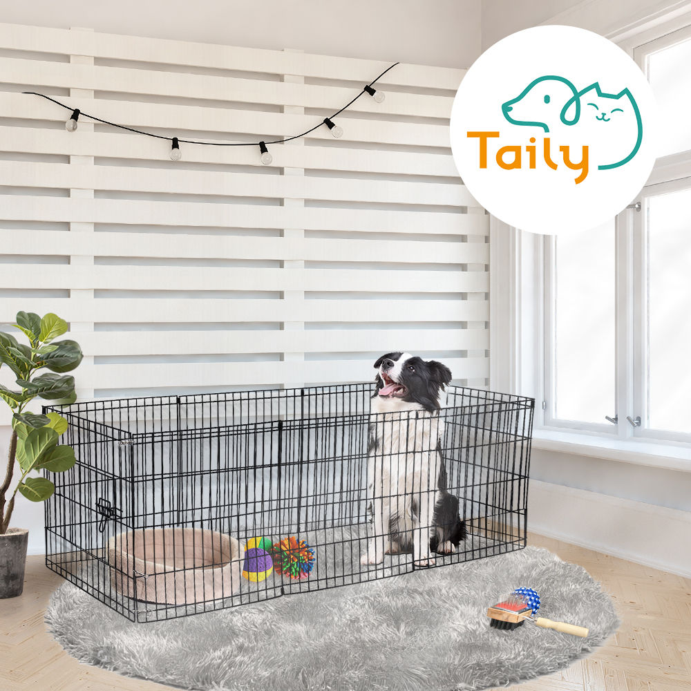 Are you still confused about your pets messing up home while playing? Taily's dog playpen will eliminate this worry. you don't need to worry about your pets messing up home anymore. Our playpen in a flexible configuration, you can get 8 pannel freely set up in a different shape in your need to expand space. as well our dog playpen provides a safe enclosed and ample space for your pets to exercise and play indoors and has great fun. And It is made of powder-coated and a strong steel frame, reliable structure, premium thin iron wire, sturdy and durable, so you don't need to worry that the dog will bite off the wire mesh and destroy the playpen. Besides The lockable door design can keep your dog safe in the playpen, won't run out by accident, with enough entrance space for easy to enter and exit. Furthermore, It is also a great suit for the outdoors, the anti-rust coat, ground stakes keep the playpen stable and make it easy for you to use in outdoors circumstances. And the foldable design is convenient to store and can carry easily when you are going to travel. It is easy to set up following the introduction manual. The Taily dog playpen is Ideal for various pets including dogs, puppies, kittens, guinea pigs and rabbits etc. Make up an ample and comfortable play space for their life.