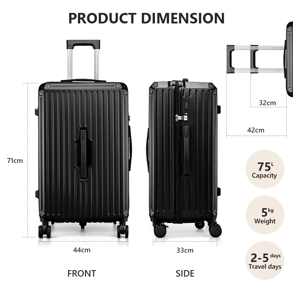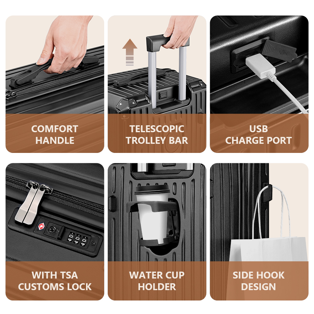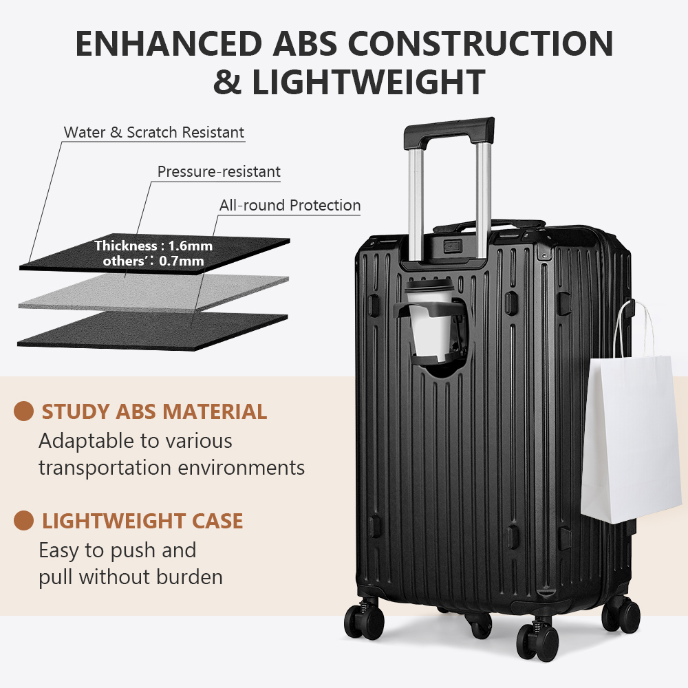 Tabibito luggage suit case with modern multifunction design and premium quality construction, made of high quality PVC surface. Also come with TSA-Approal lock. Collapsible water cup holder can convenient get the cup while you drinking. And equip USB charge port, charge your phone and other in any time. Unique side hook design make you can hang small thing, free your hands.And with smooth and lockable spinner wheels. The Classic organization designs which has the zipped compartments-a mesh compartment, a waterproof compartment and a strap to fix your cloth. Easy organize and storage more things. It's convenient to carry or manoeuvre around airports, train stations or any transport hub. Enjoy your journey with Tabibito luggage suit case.