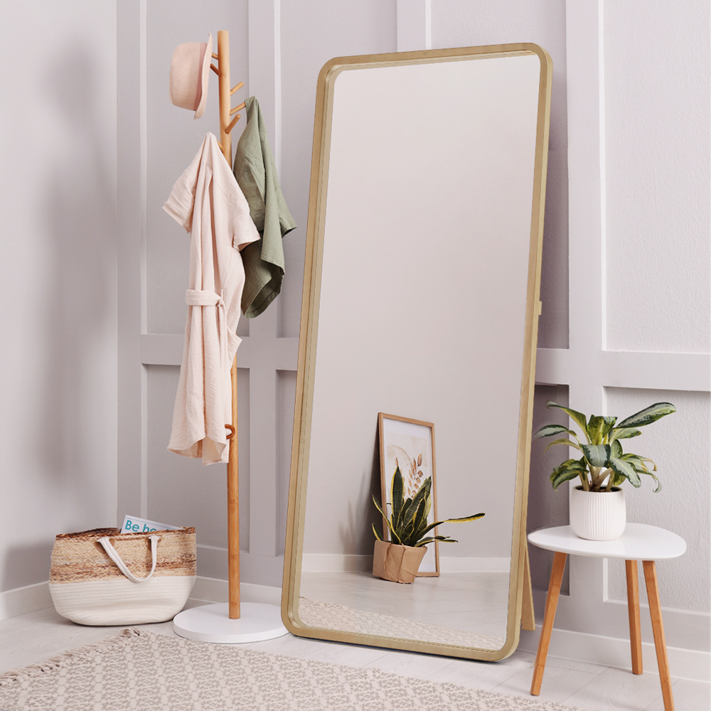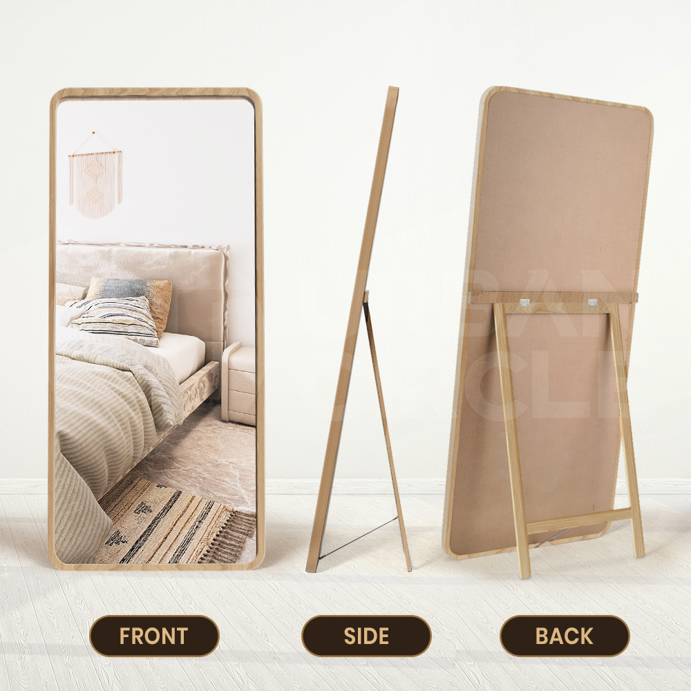 Our stunning Wooden Full-Length Mirror, the perfect blend of style, functionality, and quality craftsmanship. Whether you're furnishing a bedroom, dressing room, or living space, this mirror is designed to make a statement.The mirror features a premium solid wood frame that not only adds a touch of sophistication but also ensures durability and stability. Experience crystal clear reflections that accurately represent your appearance. Not only does our wooden mirror serve as a functional piece, but it also adds Minimalist style to your room.